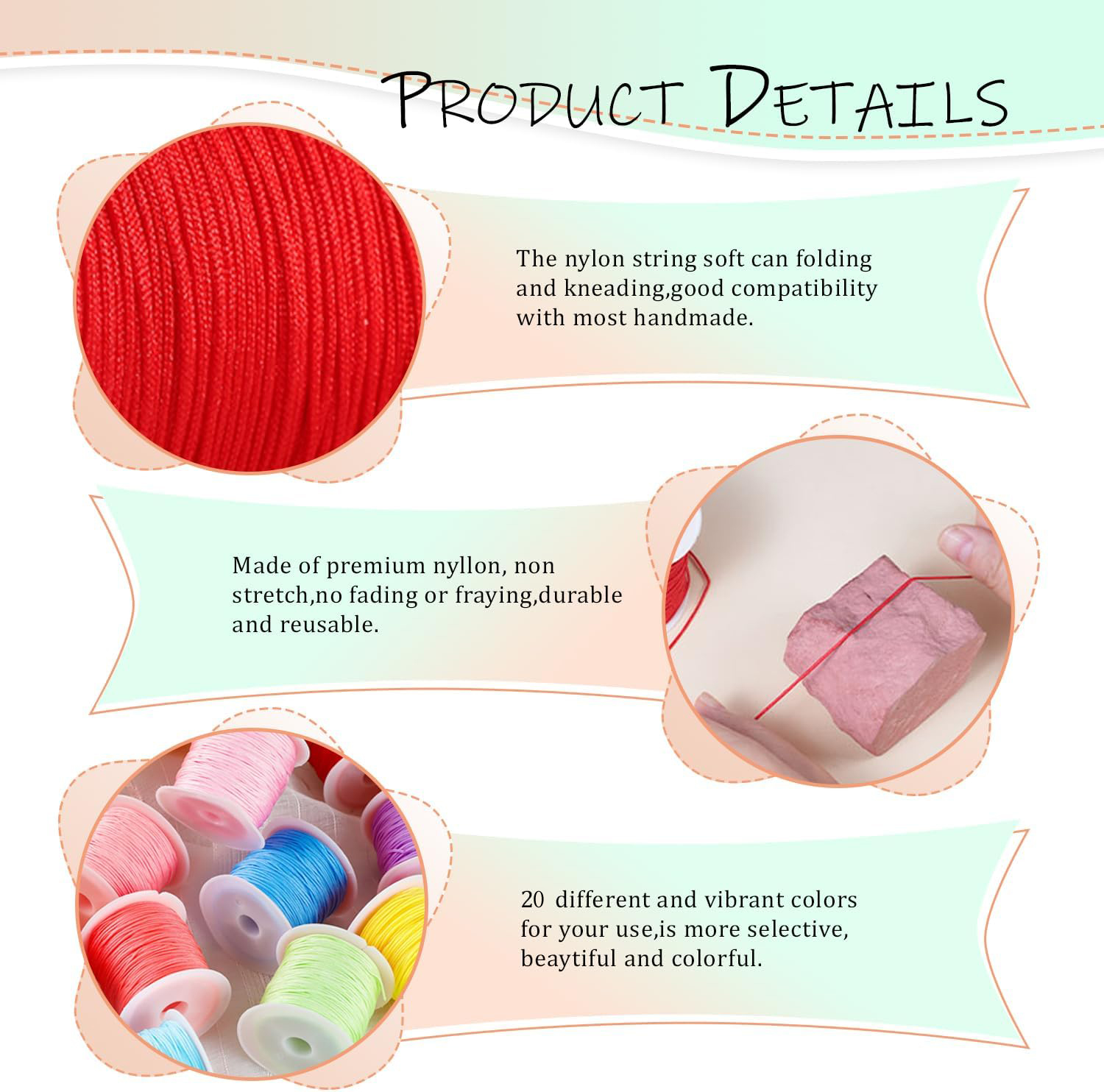 - Beautiful Colors: The nylon cord for jewelry making is in 20 bright colors, the vibrant colors that are suitable for DIY crafts, they are perfect for making bracelets and necklaces, restringing wind chimes, wrapping rocks, making tassels dreamcatchers, and macrame